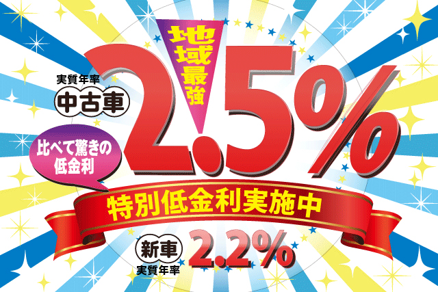 新車の金利はなんと、2.5%です。借入期間は最高10年(120回)で対応しています。